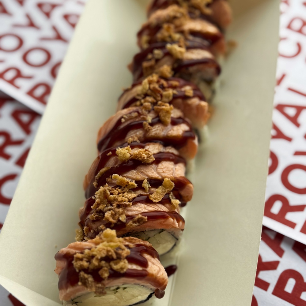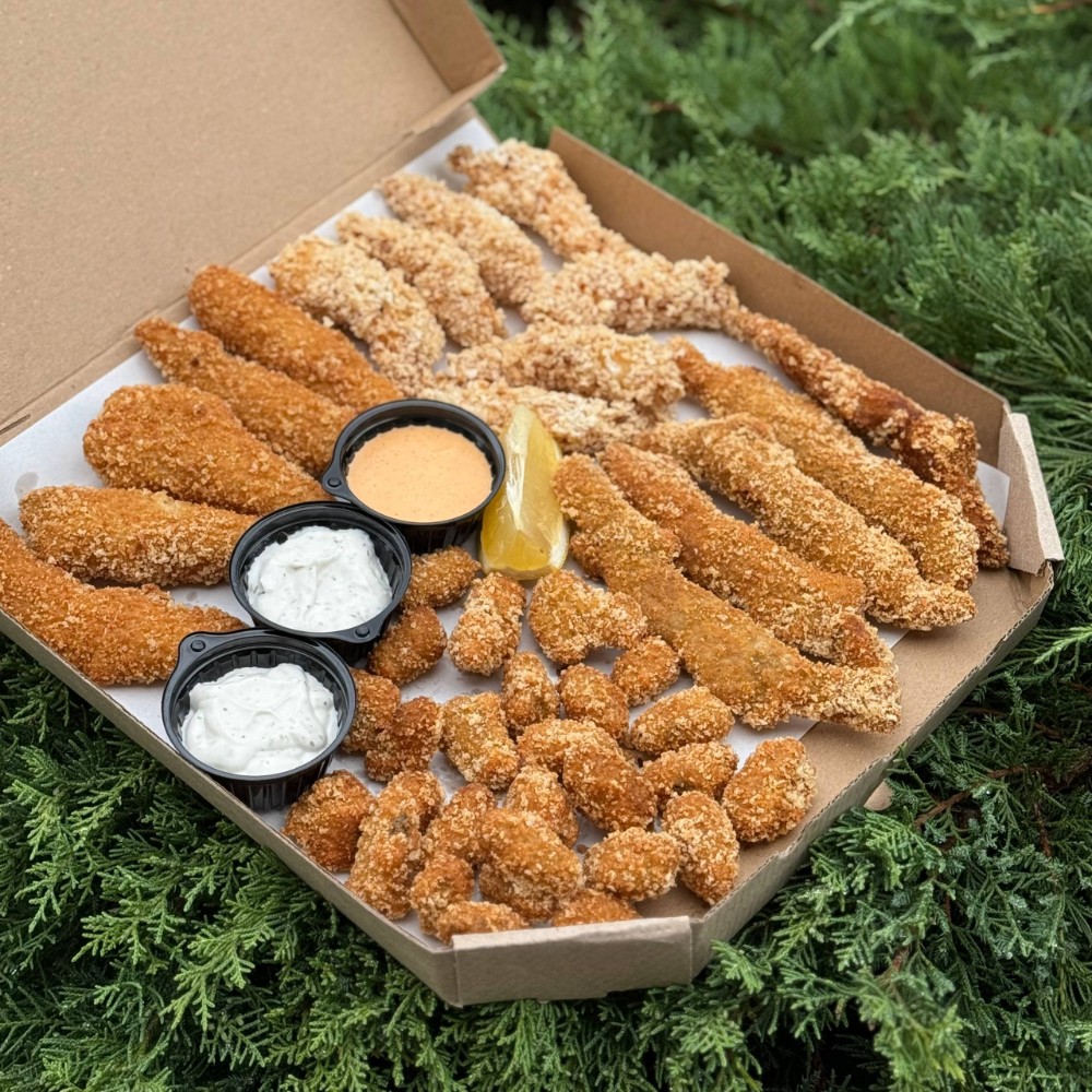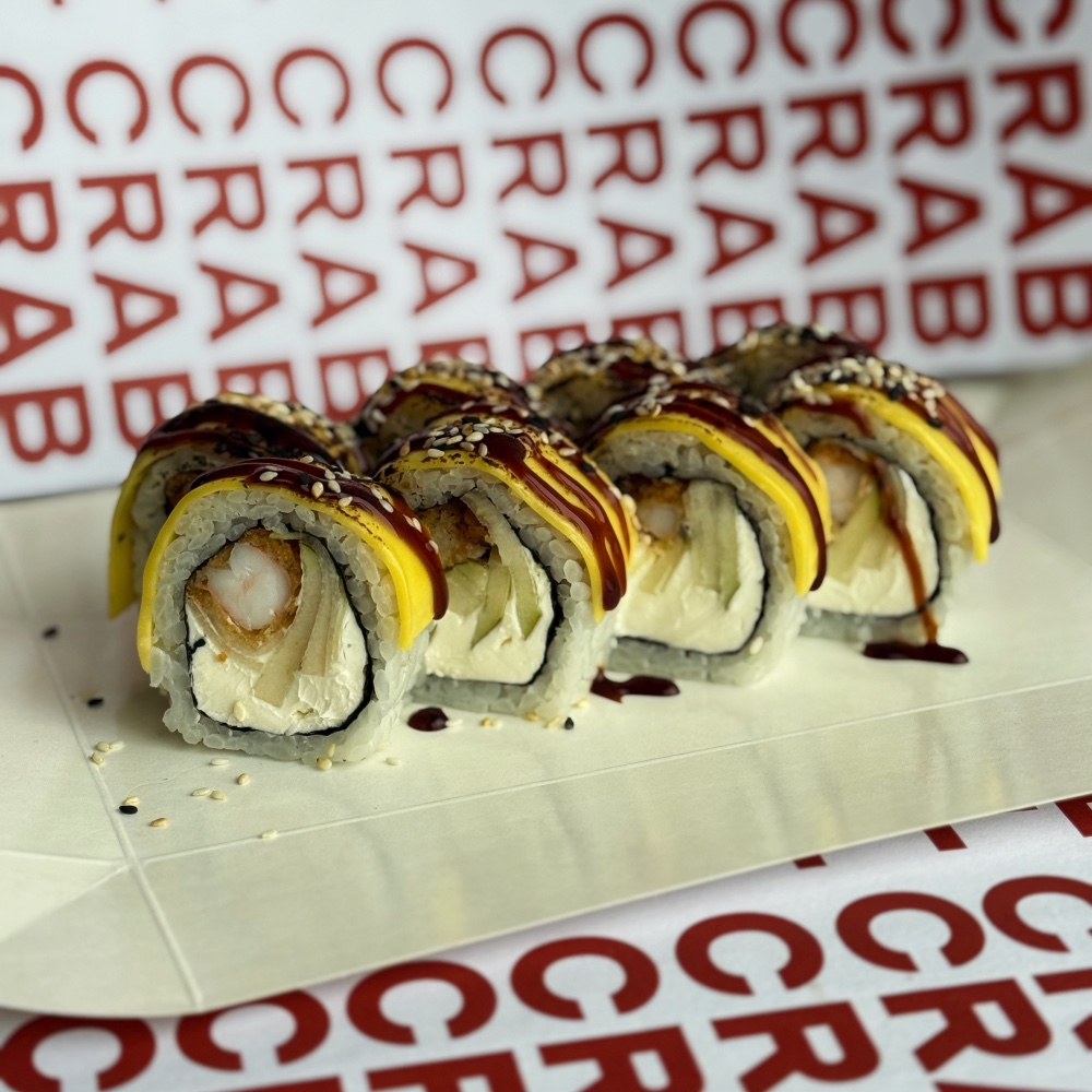 Подаю з соусом зі журавлини, часниковим та кетчупом.4 імбиря,4 васабі та 4 соєвого соусу.